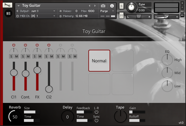 For the Toy Guitar, we sampled the strings at the head of an electric guitar, before the beginning of the fretboard.