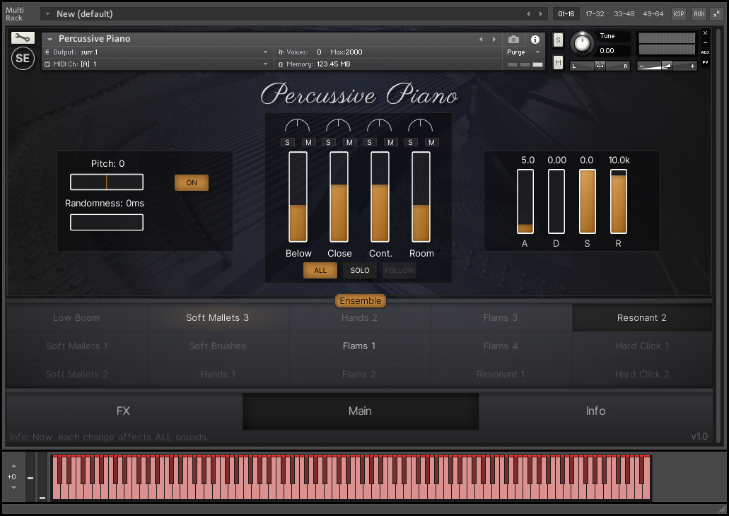 Percussive Piano — An old piano played with various mallets creating a huge natural reverb